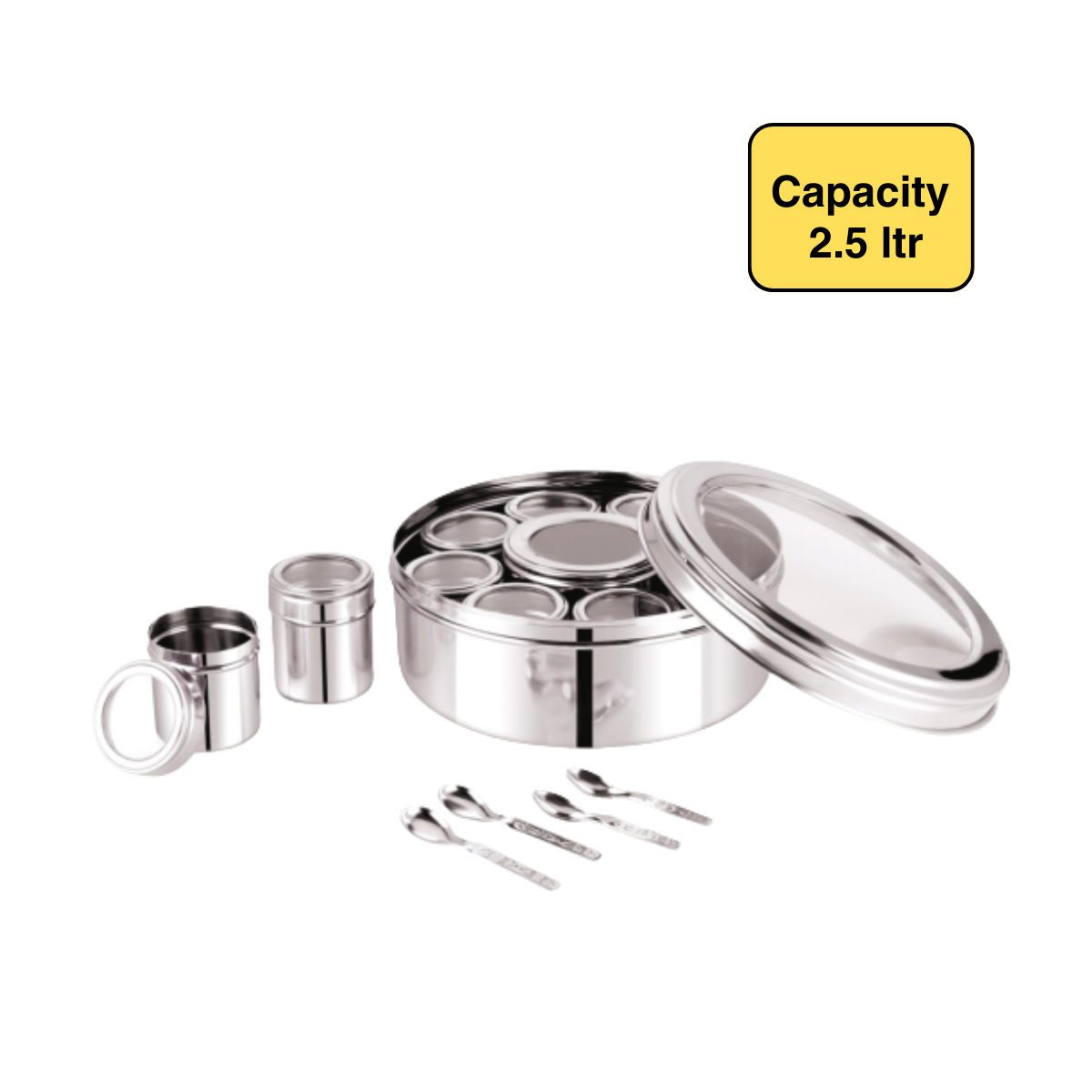 A high-capacity masala dabba designed to store a wider variety of spices in one organized, easy-to-access box for everyday cooking.